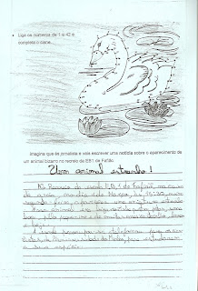 Partindo deste, fez-se um trabalho escrito, no qual os alunos aos pares, e aplicando a estrutura da tipologia de textos, fizeram uma notícia "Um animal bizarro..."